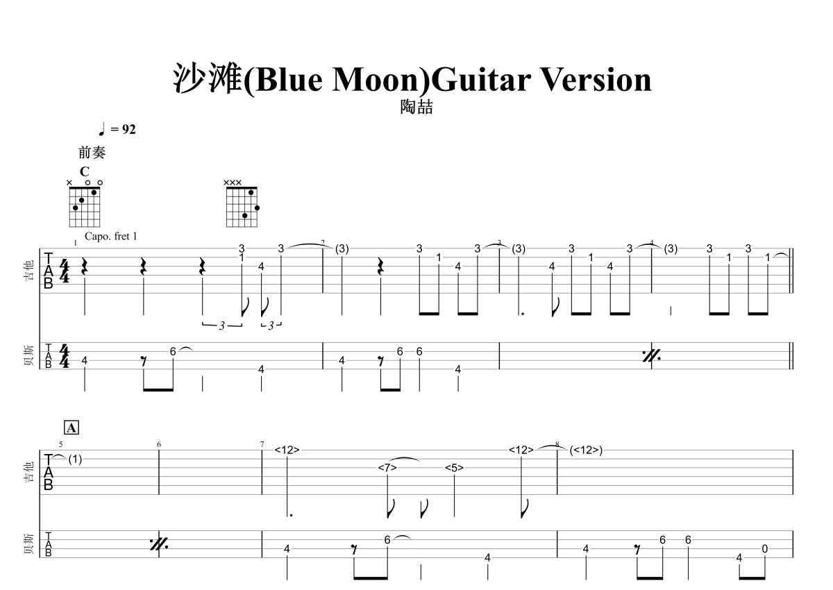 《沙滩》是陶喆演唱的一首歌曲,石头音乐原版记谱,拍号为4/4拍,歌曲速度为每分钟92拍,歌曲原调为Db调,但由于原调指法比较难,为了方便弹奏,本吉他谱采用的是C调指法编配,变调夹1品弹奏即为原调,当然也可以根据自己的音域改变变调夹位置,或者通过改变和弦调性,以方便自己弹奏,这份吉他谱共有六张高清图谱,图谱由 @石头音乐 编配上传,图谱使用六线谱编配,曲谱配备了相关的音频提供试听,使用这份沙滩吉他谱,可以让你更加方便地掌握这首歌曲的演奏技巧,快来尝试吧。原版记谱包含电吉他及贝斯,电吉他神来之笔,设计非常巧妙,很值得研究学习,注意六弦降全音为D。