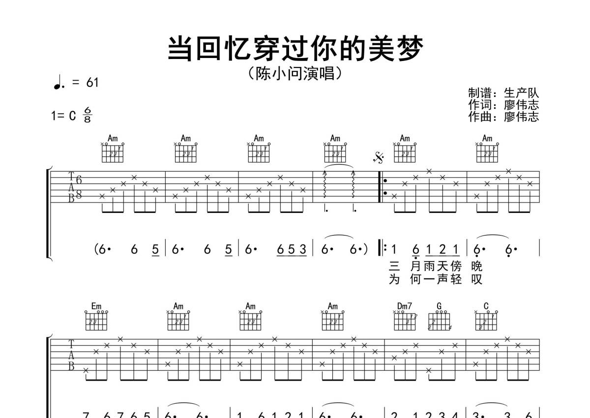 《当回忆穿过你的美梦》是陈小问演唱的一首歌曲,精编版,拍号为6/8拍,歌曲速度为每分钟61拍,歌曲原调为C调,本吉他谱采用的是C调指法编配,演奏时不需要使用变调夹即为原调,这份吉他谱共有两张高清图谱,图谱由 @生产队 编配上传,图谱使用六线谱编配,包含吉他和弦指法、简谱以及歌词部分,使用这份当回忆穿过你的美梦吉他谱,可以让你更加方便地掌握这首歌曲的弹唱技巧,快来尝试吧。《当回忆穿过你的美梦》是由廖伟志作词、作曲,陈小问演唱的一首民谣歌曲。本吉他谱根据原版C调指法编配,一音不差版,值得推荐的一首民谣歌曲!。