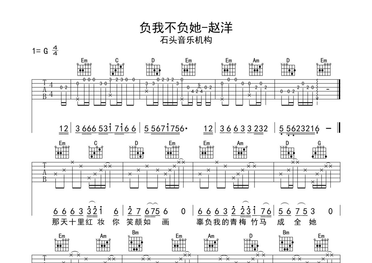 负我不负她吉他谱 - 赵洋演唱 - G调弹唱六线谱 - 石头音乐原版记谱