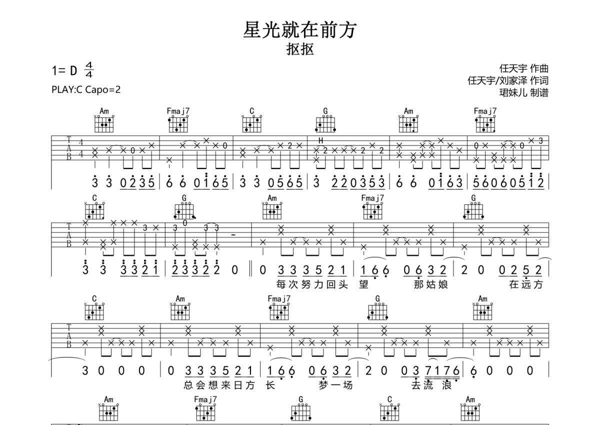 抠抠《星光就在前方》吉他谱 - C调弹唱六线谱