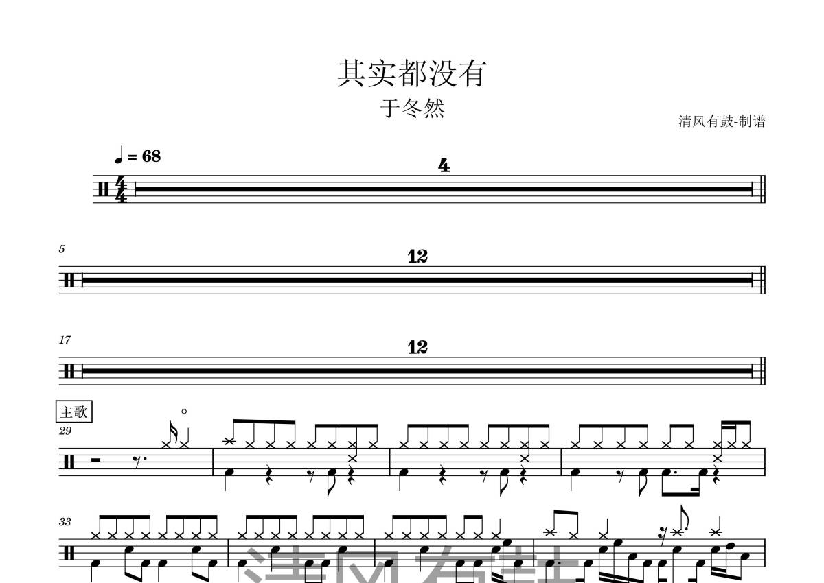 《其实都没有》是于冬然演唱的一首歌曲,拍号为4/4拍,歌曲速度为每分钟68拍,这份鼓谱共有两张高清图谱,图谱由 @王远康 编配上传,图谱使用五线谱编配,使用这份其实都没有架子鼓谱,你将能够轻松地敲打出这首于冬然的其实都没有,快来尝试吧。《其实都没有》 于冬然 带伴奏。