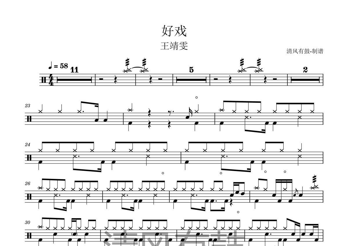 《好戏》是王靖雯演唱的一首歌曲,拍号为4/4拍,歌曲速度为每分钟58拍,这份鼓谱共有一张高清图谱,图谱由 @王远康 编配上传,图谱使用五线谱编配,使用这份好戏架子鼓谱,你将能够轻松地敲打出这首王靖雯的好戏,快来尝试吧。