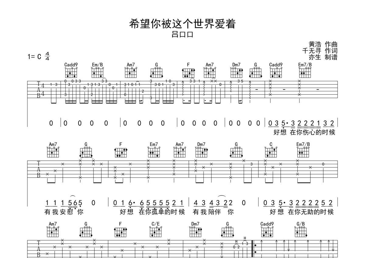 吕口口《希望你被这个世界爱着》吉他谱 - C调弹唱六线谱
