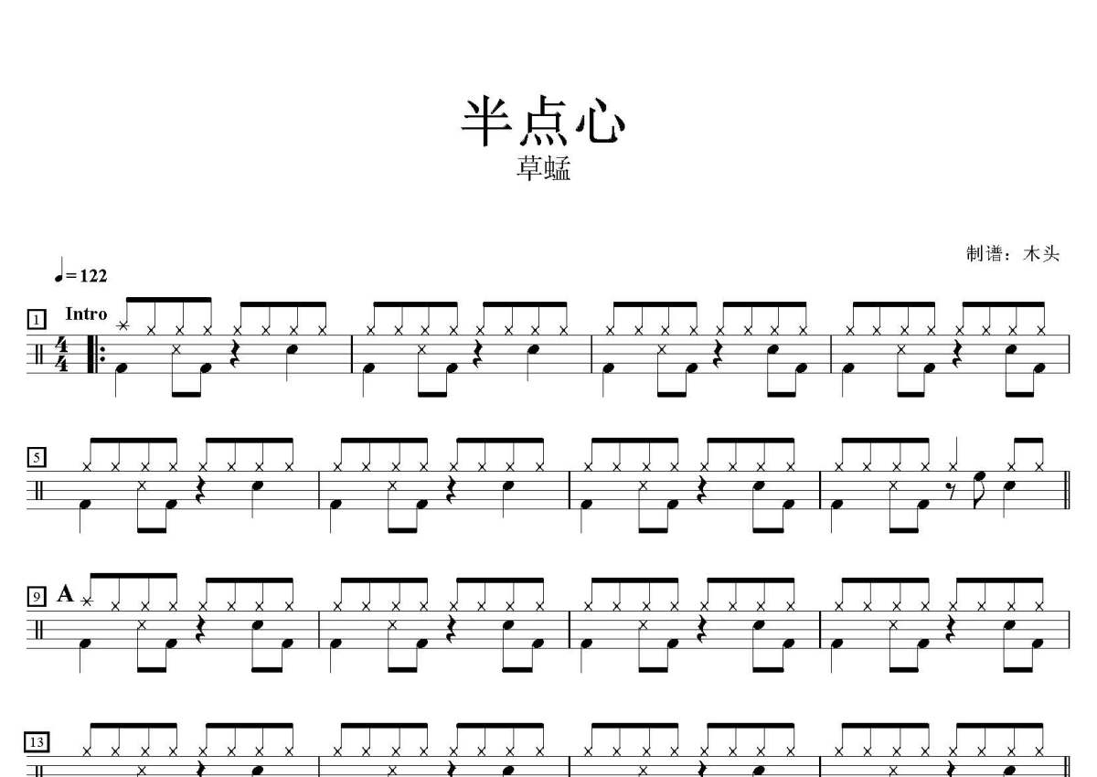 《半点心》是草蜢演唱的一首歌曲,这份鼓谱共有两张高清图谱,图谱由 @打鼓谱 编配上传,图谱使用五线谱编配,使用这份半点心架子鼓谱,你将能够轻松地敲打出这首草蜢的半点心,快来尝试吧。歌曲名:半点心,歌手名:草蜢,专辑名:Grasshopper IV。