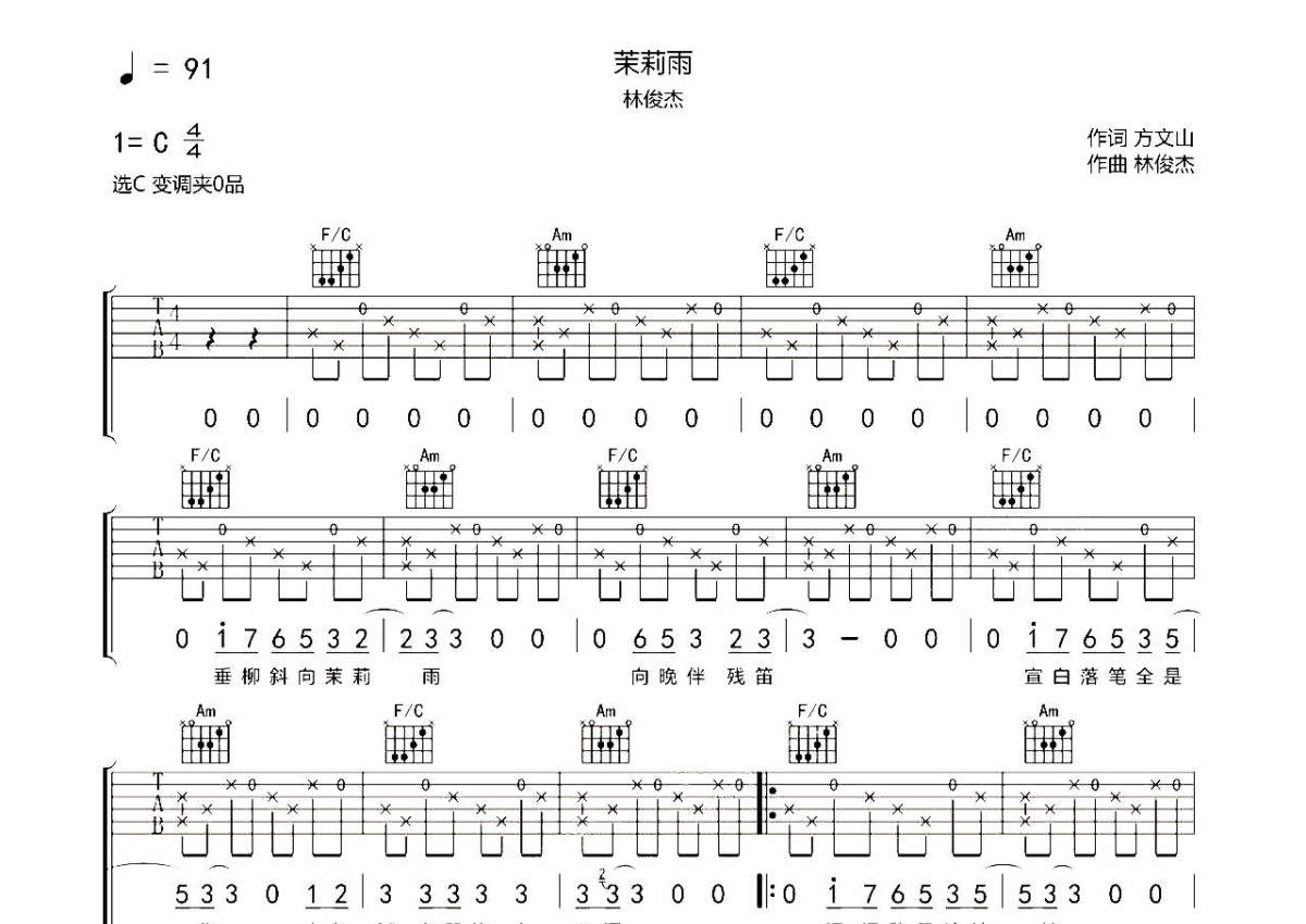 林俊杰《茉莉雨》吉他谱 - C调弹唱六线谱