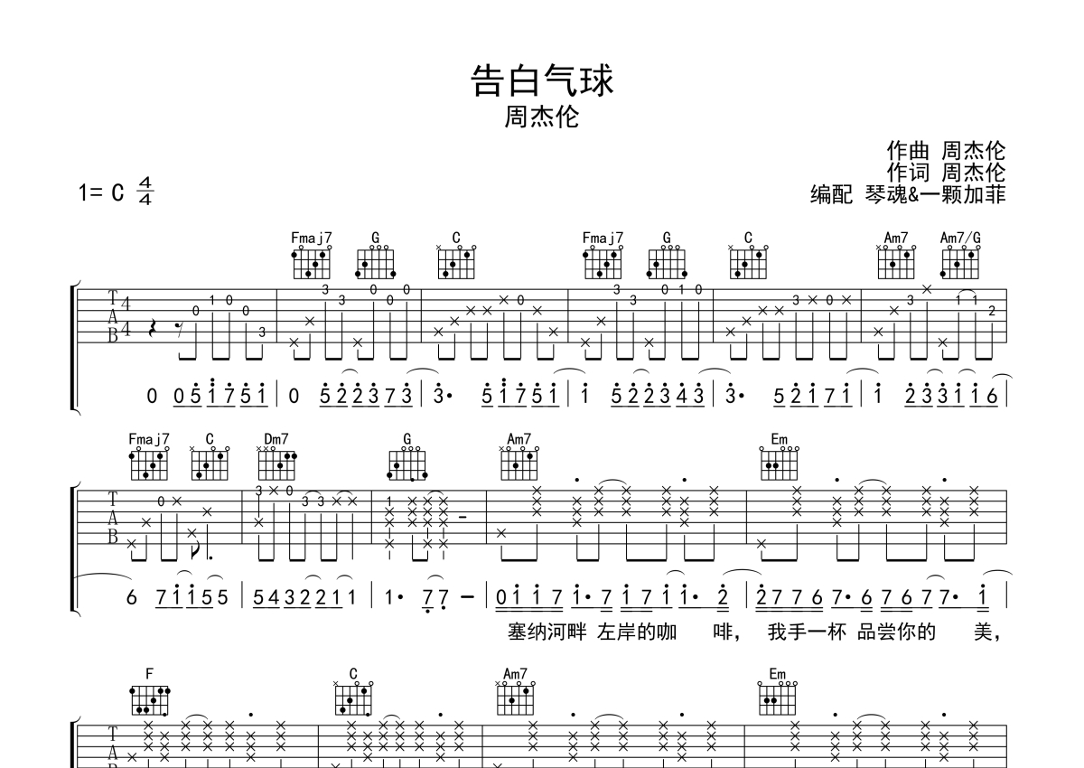 周杰伦《告白气球》吉他谱 - C调弹唱六线谱