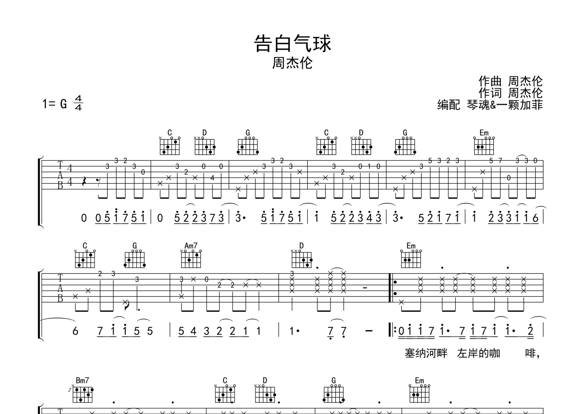 周杰伦《告白气球》吉他谱 - G调弹唱六线谱