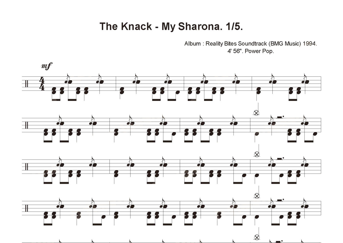 《My Sharona》是Knack演唱的一首歌曲,这份鼓谱共有五张高清图谱,图谱由 @打鼓谱 编配上传,图谱使用五线谱编配,使用这份My Sharona架子鼓谱,你将能够轻松地敲打出这首Knack的My Sharona,快来尝试吧。首张收录专辑: Get the Knack 发行时间: 1979 年 提名: 最佳搖滾團體演奏獎, 全美音乐奖最受欢迎流行/摇滚单曲 流派: 新浪潮, 强力流行, 摇滚。