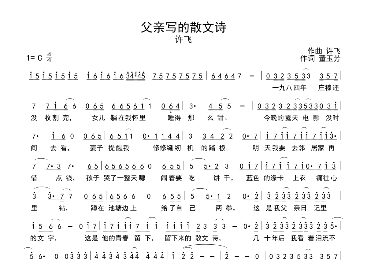 《父亲写的散文诗》是许飞演唱的一首歌曲,拍号为4/4拍,这份简谱共有一张高清图谱,图谱由 @打谱啦 编配上传。