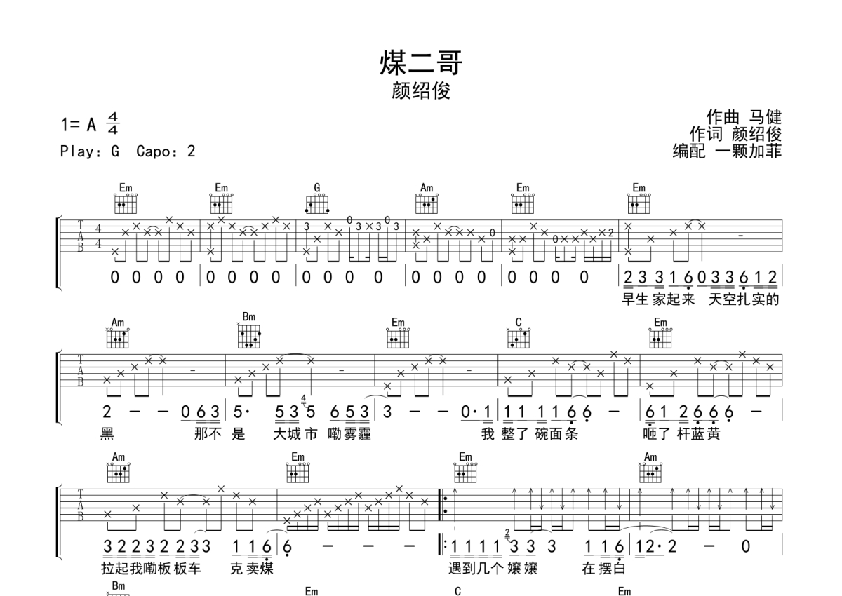 颜绍俊《煤二哥》吉他谱 - G调弹唱六线谱