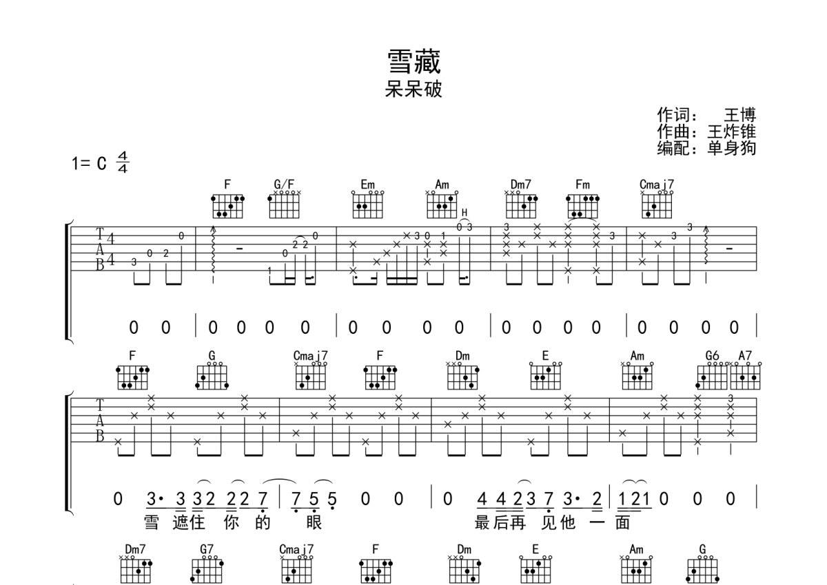 呆呆破《雪藏》吉他谱 - C调弹唱六线谱