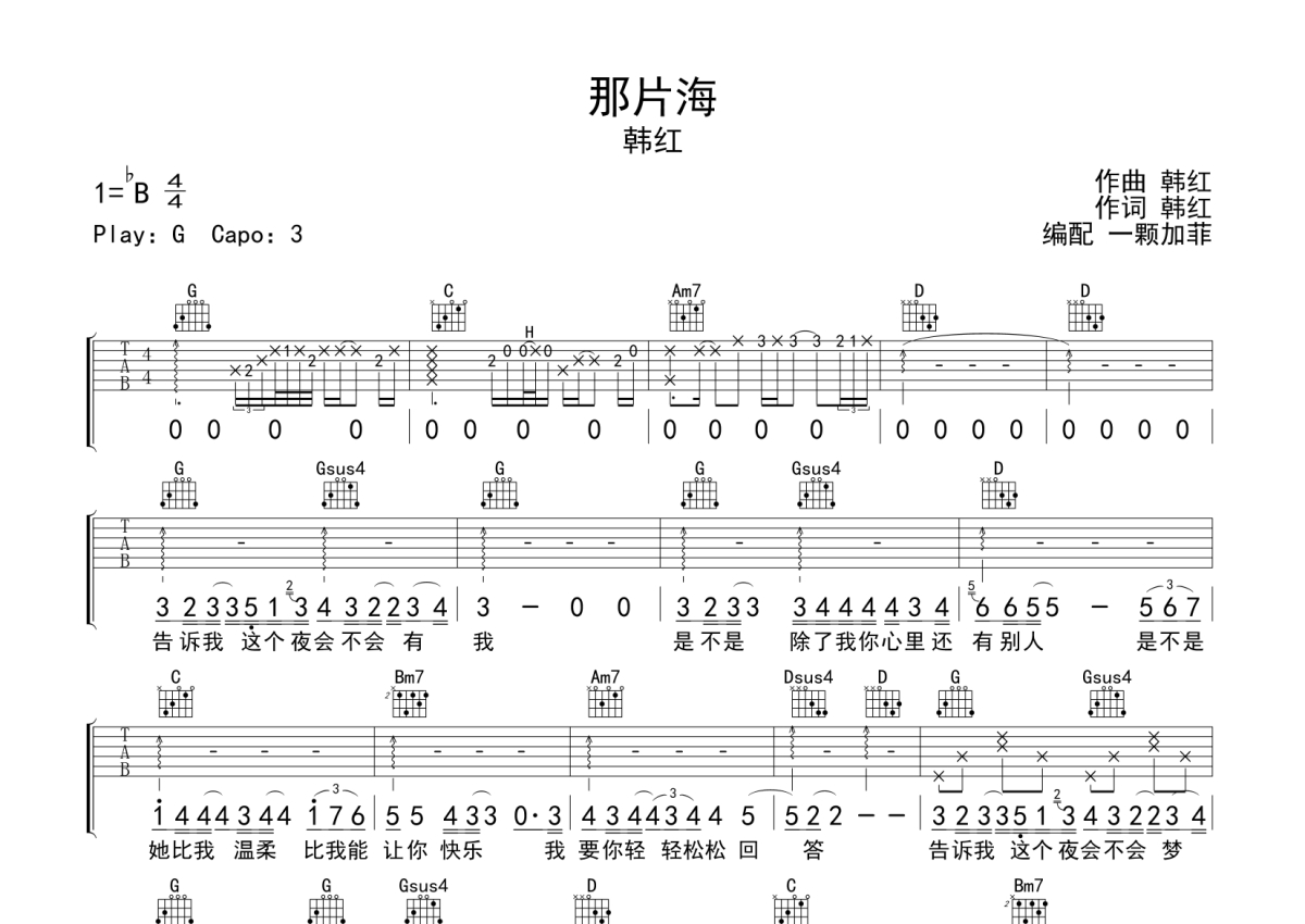 《那片海》是韩红演唱的一首歌曲,拍号为4/4拍,歌曲原调为Bb调,但由于原调指法比较难,为了方便弹奏,本吉他谱采用的是G调指法编配,变调夹3品弹奏即为原调,当然也可以根据自己的音域改变变调夹位置,或者通过改变和弦调性,以方便自己弹奏,这份吉他谱共有两张高清图谱,图谱由 @一颗加菲 编配上传,图谱使用六线谱编配,包含吉他和弦指法、简谱以及歌词部分,曲谱配备了相关的音频提供试听,使用这份那片海吉他谱,可以让你更加方便地掌握这首歌曲的弹唱技巧,快来尝试吧。