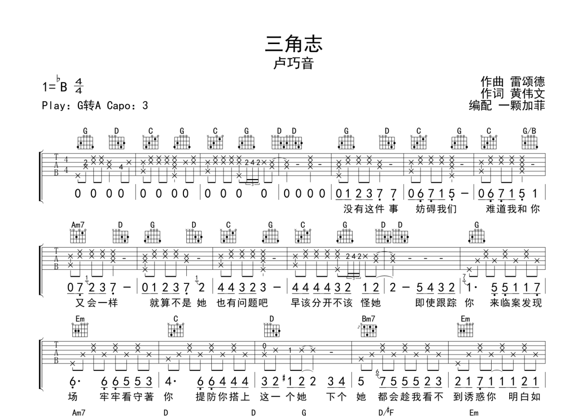 卢巧音《三角志》吉他谱 - G调弹唱六线谱