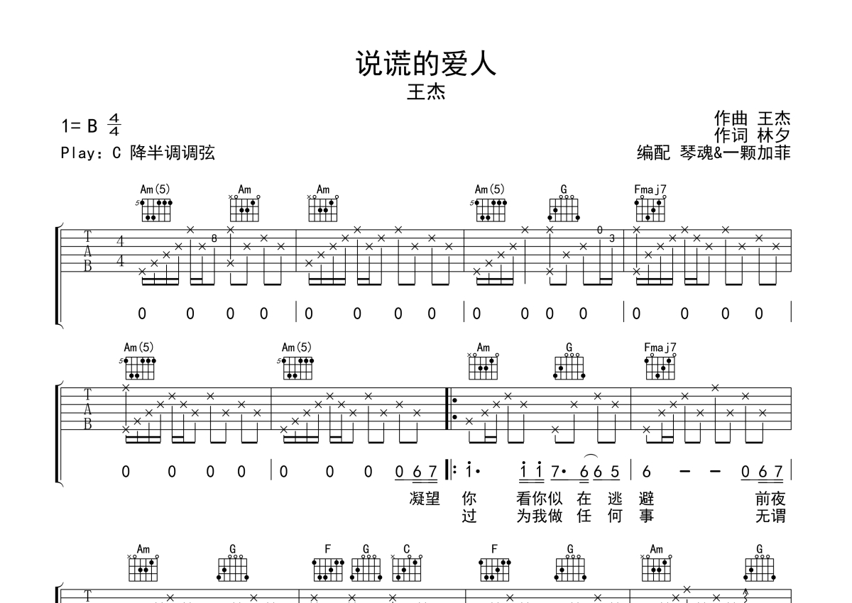 《说谎的爱人》是王杰演唱的一首歌曲,拍号为4/4拍,歌曲原调为B调,但由于原调指法比较难,为了方便弹奏,本吉他谱采用的是C调指法编配,降半音调弦弹奏即为原调,当然也可以根据自己的音域决定是否调弦,这份吉他谱共有三张高清图谱,图谱由 @一颗加菲 编配上传,图谱使用六线谱编配,包含吉他和弦指法、简谱以及歌词部分,曲谱配备了相关的音频提供试听,使用这份说谎的爱人吉他谱,可以让你更加方便地掌握这首歌曲的弹唱技巧,快来尝试吧。