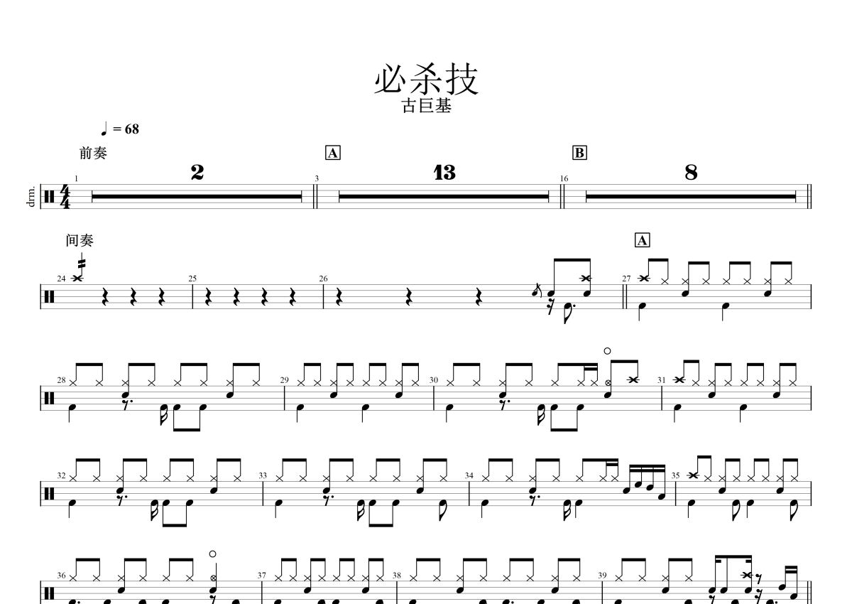 《必杀技》是古巨基演唱的一首歌曲,拍号为4/4拍,歌曲速度为每分钟68拍,这份鼓谱共有两张高清图谱,图谱由 @打鼓老被骂 编配上传,图谱使用五线谱编配,使用这份必杀技架子鼓谱,你将能够轻松地敲打出这首古巨基的必杀技,快来尝试吧。
