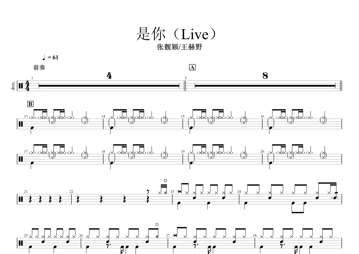 张靓颖/王赫野《是你》鼓谱 - 架子鼓谱 - live