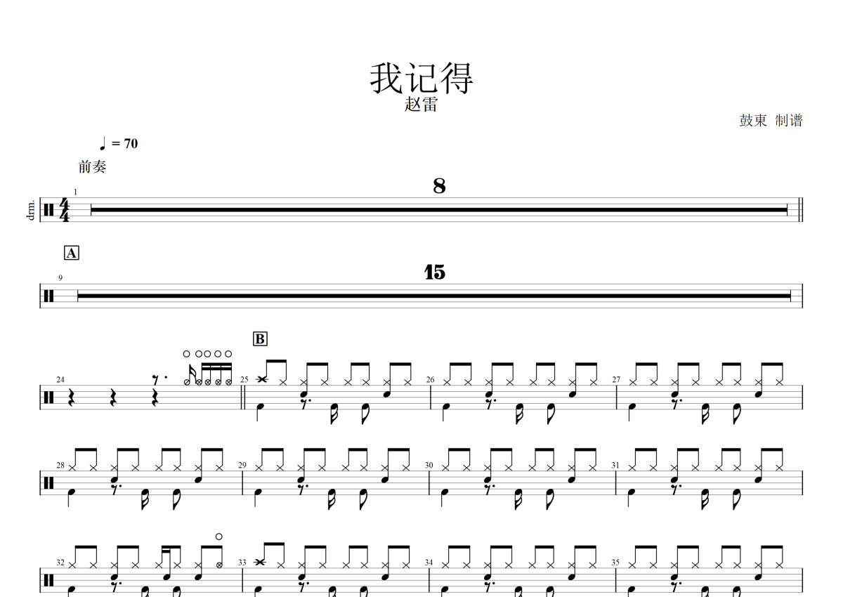 《我记得》是赵雷演唱的一首歌曲,拍号为4/4拍,歌曲速度为每分钟70拍,这份鼓谱共有两张高清图谱,图谱由 @打鼓老被骂 编配上传,图谱使用五线谱编配,使用这份我记得架子鼓谱,你将能够轻松地敲打出这首赵雷的我记得,快来尝试吧。