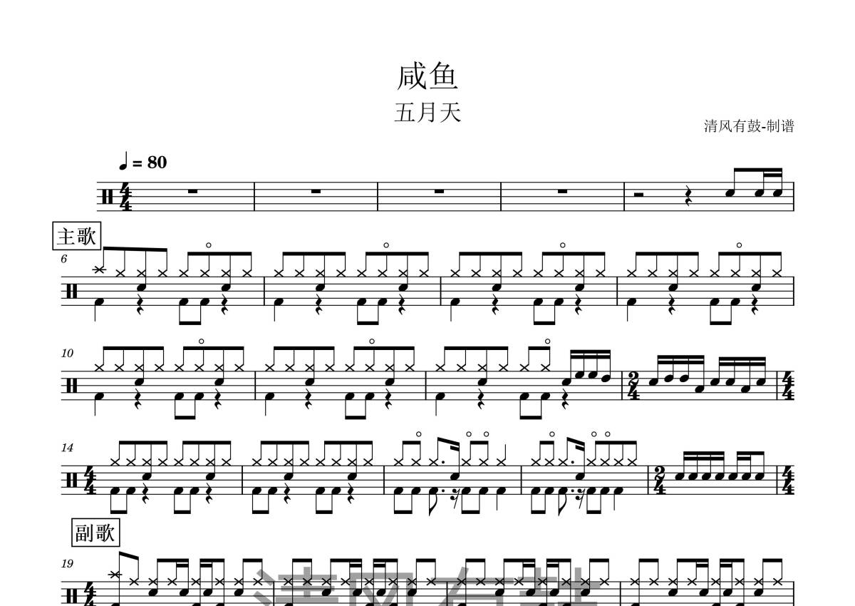 《咸鱼》是五月天演唱的一首歌曲,拍号为4/4拍,歌曲速度为每分钟80拍,这份鼓谱共有两张高清图谱,图谱由 @王远康 编配上传,图谱使用五线谱编配,使用这份咸鱼架子鼓谱,你将能够轻松地敲打出这首五月天的咸鱼,快来尝试吧。