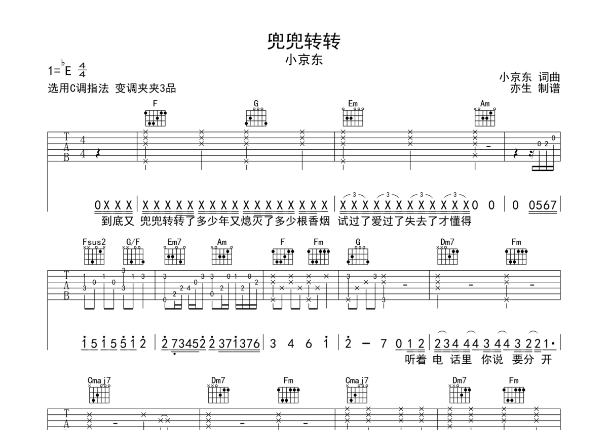 《兜兜转转》是小京东演唱的一首歌曲,拍号为4/4拍,歌曲原调为Eb调,但由于原调指法比较难,为了方便弹奏,本吉他谱采用的是C调指法编配,变调夹3品弹奏即为原调,当然也可以根据自己的音域改变变调夹位置,或者通过改变和弦调性,以方便自己弹奏,这份吉他谱共有三张高清图谱,图谱由 @亦生 编配上传,图谱使用六线谱编配,包含吉他和弦指法、简谱以及歌词部分,使用这份兜兜转转吉他谱,可以让你更加方便地掌握这首歌曲的弹唱技巧,快来尝试吧。