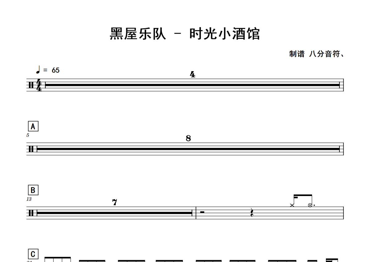 《时光小酒馆》是黑屋乐队演唱的一首歌曲,拍号为4/4拍,歌曲速度为每分钟65拍,这份鼓谱共有两张高清图谱,图谱由 @老虎不说谎 编配上传,图谱使用五线谱编配,使用这份时光小酒馆架子鼓谱,你将能够轻松地敲打出这首黑屋乐队的时光小酒馆,快来尝试吧。