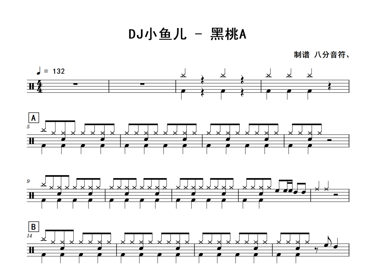 《黑桃A》是DJ小鱼儿演唱的一首歌曲,拍号为4/4拍,歌曲速度为每分钟132拍,这份鼓谱共有三张高清图谱,图谱由 @老虎不说谎 编配上传,图谱使用五线谱编配,使用这份黑桃A架子鼓谱,你将能够轻松地敲打出这首DJ小鱼儿的黑桃A,快来尝试吧。