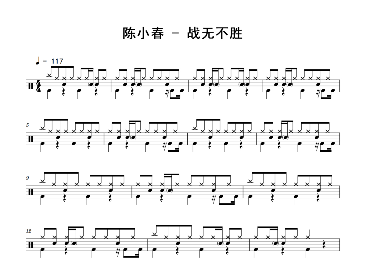 《战无不胜》是陈小春演唱的一首歌曲,拍号为4/4拍,歌曲速度为每分钟117拍,这份鼓谱共有三张高清图谱,图谱由 @老虎不说谎 编配上传,图谱使用五线谱编配,使用这份战无不胜架子鼓谱,你将能够轻松地敲打出这首陈小春的战无不胜,快来尝试吧。