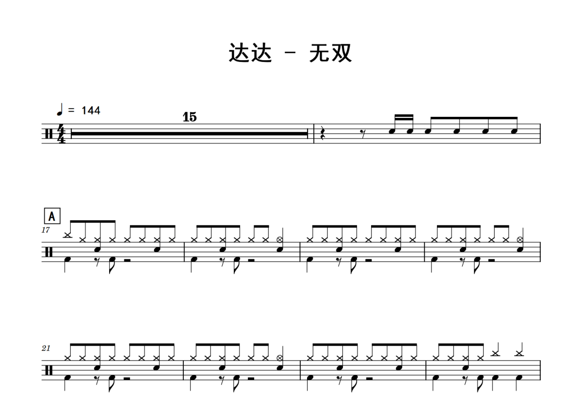 《无双》是达达乐队演唱的一首歌曲,拍号为4/4拍,歌曲速度为每分钟144拍,这份鼓谱共有四张高清图谱,图谱由 @老虎不说谎 编配上传,图谱使用五线谱编配,使用这份无双架子鼓谱,你将能够轻松地敲打出这首达达乐队的无双,快来尝试吧。