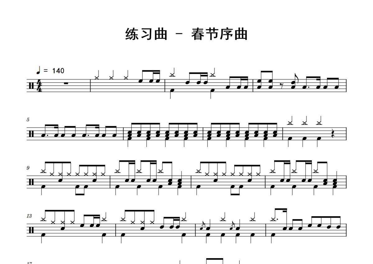 《春节序曲》是练习曲演唱的一首歌曲,练习曲,拍号为4/4拍,歌曲速度为每分钟140拍,这份鼓谱共有两张高清图谱,图谱由 @老虎不说谎 编配上传,图谱使用五线谱编配,使用这份春节序曲架子鼓谱,你将能够轻松地敲打出这首练习曲的春节序曲,快来尝试吧。