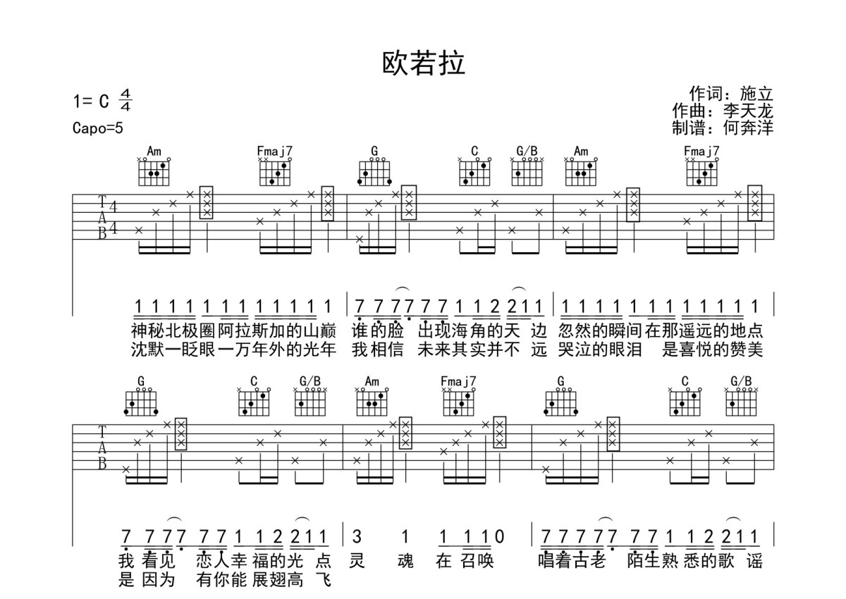 《欧若拉》是张韶涵演唱的一首歌曲,简单版,本吉他谱采用的是C调指法编配,这份吉他谱共有两张高清图谱,图谱由 @何奔洋 编配上传,图谱使用六线谱编配,包含吉他和弦指法、简谱以及歌词部分,使用这份欧若拉吉他谱,可以让你更加方便地掌握这首歌曲的弹唱技巧,快来尝试吧。简单编配,四个和弦无横按,适合新手。