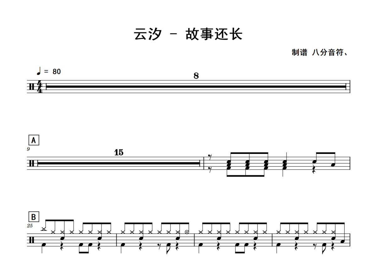 《故事还长》是云汐演唱的一首歌曲,拍号为4/4拍,歌曲速度为每分钟80拍,这份鼓谱共有两张高清图谱,图谱由 @老虎不说谎 编配上传,图谱使用五线谱编配,使用这份故事还长架子鼓谱,你将能够轻松地敲打出这首云汐的故事还长,快来尝试吧。