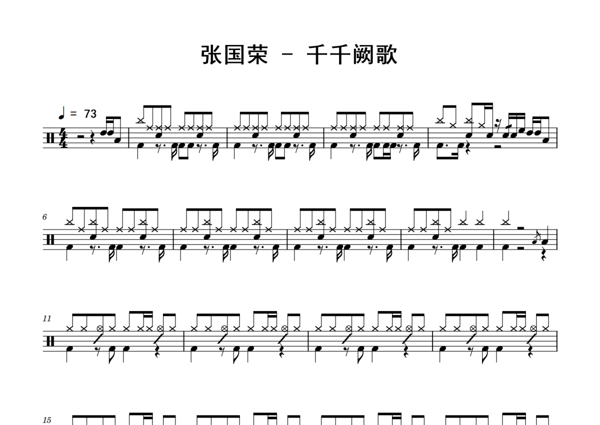 《千千阙歌》是张国荣演唱的一首歌曲,拍号为4/4拍,歌曲速度为每分钟73拍,这份鼓谱共有两张高清图谱,图谱由 @老虎不说谎 编配上传,图谱使用五线谱编配,使用这份千千阙歌架子鼓谱,你将能够轻松地敲打出这首张国荣的千千阙歌,快来尝试吧。