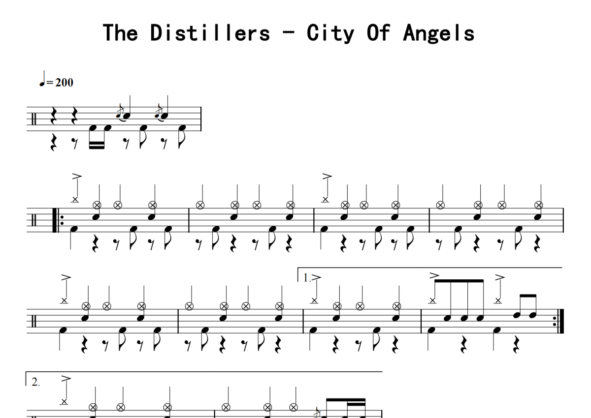 《City Of Angels》是The Distillers演唱的一首歌曲,拍号为4/4拍,歌曲速度为每分钟200拍,这份鼓谱共有五张高清图谱,图谱由 @老虎不说谎 编配上传,图谱使用五线谱编配,使用这份City Of Angels架子鼓谱,你将能够轻松地敲打出这首The Distillers的City Of Angels,快来尝试吧。