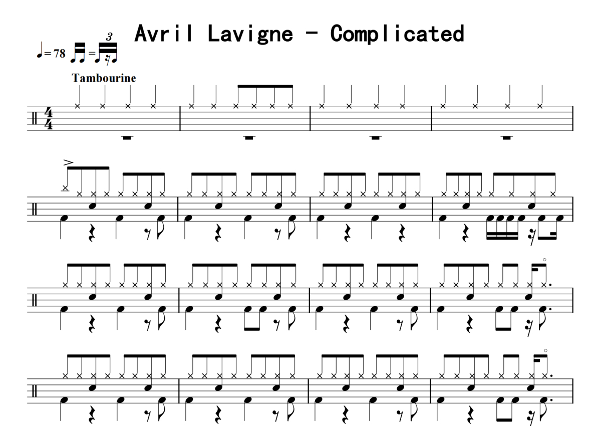 《Complicated》是Avril Lavigne演唱的一首歌曲,拍号为4/4拍,歌曲速度为每分钟78拍,这份鼓谱共有三张高清图谱,图谱由 @老虎不说谎 编配上传,图谱使用五线谱编配,使用这份Complicated架子鼓谱,你将能够轻松地敲打出这首Avril Lavigne的Complicated,快来尝试吧。