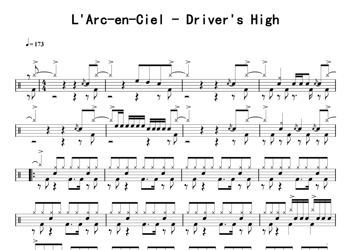 《Driver's High》是L'Arc-en-Ciel演唱的一首歌曲,拍号为4/4拍,歌曲速度为每分钟173拍,这份鼓谱共有四张高清图谱,图谱由 @老虎不说谎 编配上传,图谱使用五线谱编配,使用这份Driver's High架子鼓谱,你将能够轻松地敲打出这首L'Arc-en-Ciel的Driver's High,快来尝试吧。