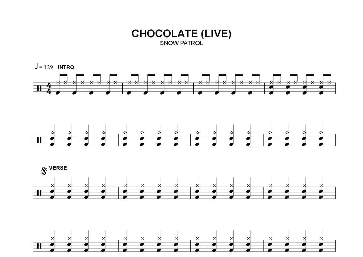 《chocolate》是snow patrol演唱的一首歌曲,这份鼓谱共有一张高清图谱,图谱由 @打鼓谱 编配上传,图谱使用五线谱编配,使用这份chocolate架子鼓谱,你将能够轻松地敲打出这首snow patrol的chocolate,快来尝试吧。《chocolate》现场版。Snow Patrol(雪地巡游者) 成立于苏格兰,是被格莱美奖提名的另类摇滚乐队。他们成员大半来自北爱尔兰当县(County Down)的班戈镇。他们以苏格兰第二大城市格拉斯哥为根据地,并签约公司Polydor Records。最初Snow Patrol只是一队独立摇滚乐队,但因为"Run"、 "Chasing Cars"等等歌曲成功成为主流音乐的一份子。