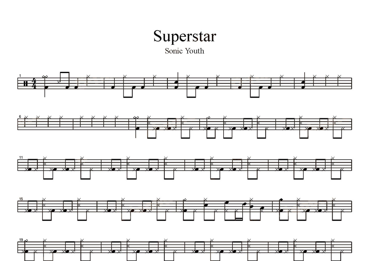 《Superstar》是Sonic Youth演唱的一首歌曲,这份鼓谱共有两张高清图谱,图谱由 @打鼓谱 编配上传,图谱使用五线谱编配,使用这份Superstar架子鼓谱,你将能够轻松地敲打出这首Sonic Youth的Superstar,快来尝试吧。《Superstar》现场版。音速青年(英语:Sonic Youth)是成立于1981年、发迹于纽约市的美国摇滚乐团。现任团员为瑟斯顿·摩尔(主唱、吉他)、金·戈登(主唱、贝斯、吉他)、李·拉纳尔多(主唱、吉他)、马克·艾伯德(贝斯)以及史蒂夫·雪莱(鼓)。