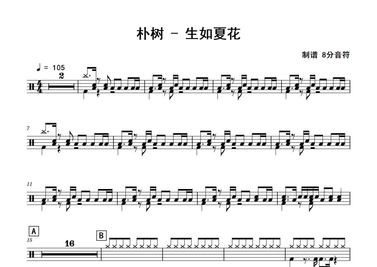 朴树《生如夏花》鼓谱 - 架子鼓谱