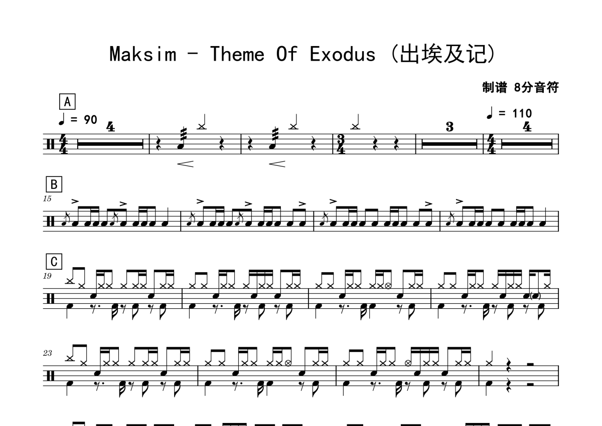 《Theme Of Exodus (出埃及记)》是Maksim演唱的一首歌曲,拍号为4/4拍,歌曲速度为每分钟90拍,这份鼓谱共有两张高清图谱,图谱由 @老虎不说谎 编配上传,图谱使用五线谱编配,使用这份Theme Of Exodus (出埃及记)架子鼓谱,你将能够轻松地敲打出这首Maksim的Theme Of Exodus (出埃及记),快来尝试吧。