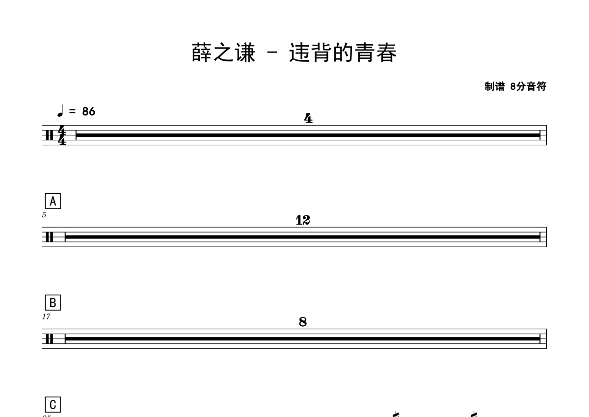 《违背的青春》是薛之谦演唱的一首歌曲,拍号为4/4拍,歌曲速度为每分钟86拍,这份鼓谱共有三张高清图谱,图谱由 @老虎不说谎 编配上传,图谱使用五线谱编配,使用这份违背的青春架子鼓谱,你将能够轻松地敲打出这首薛之谦的违背的青春,快来尝试吧。