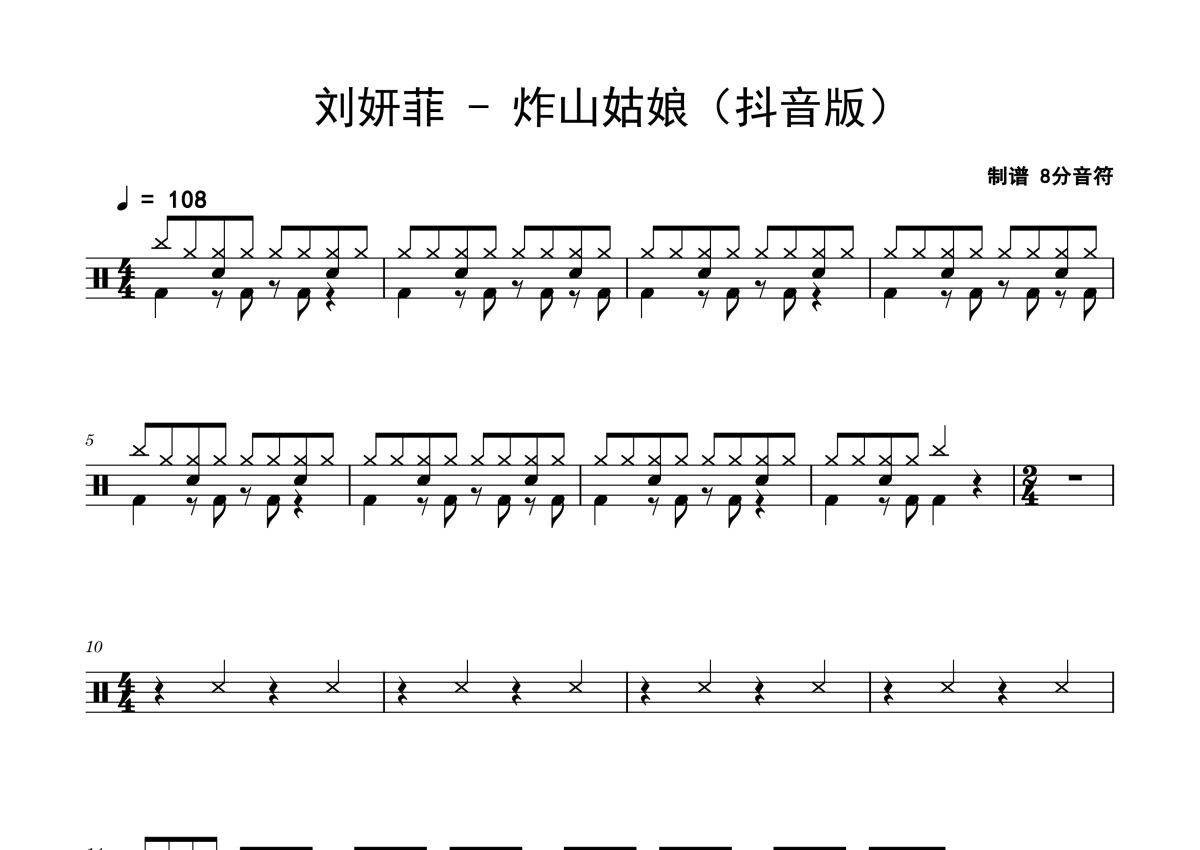 《炸山姑娘》是刘妍菲演唱的一首歌曲,抖音版,拍号为4/4拍,歌曲速度为每分钟108拍,这份鼓谱共有两张高清图谱,图谱由 @老虎不说谎 编配上传,图谱使用五线谱编配,使用这份炸山姑娘架子鼓谱,你将能够轻松地敲打出这首刘妍菲的炸山姑娘,快来尝试吧。