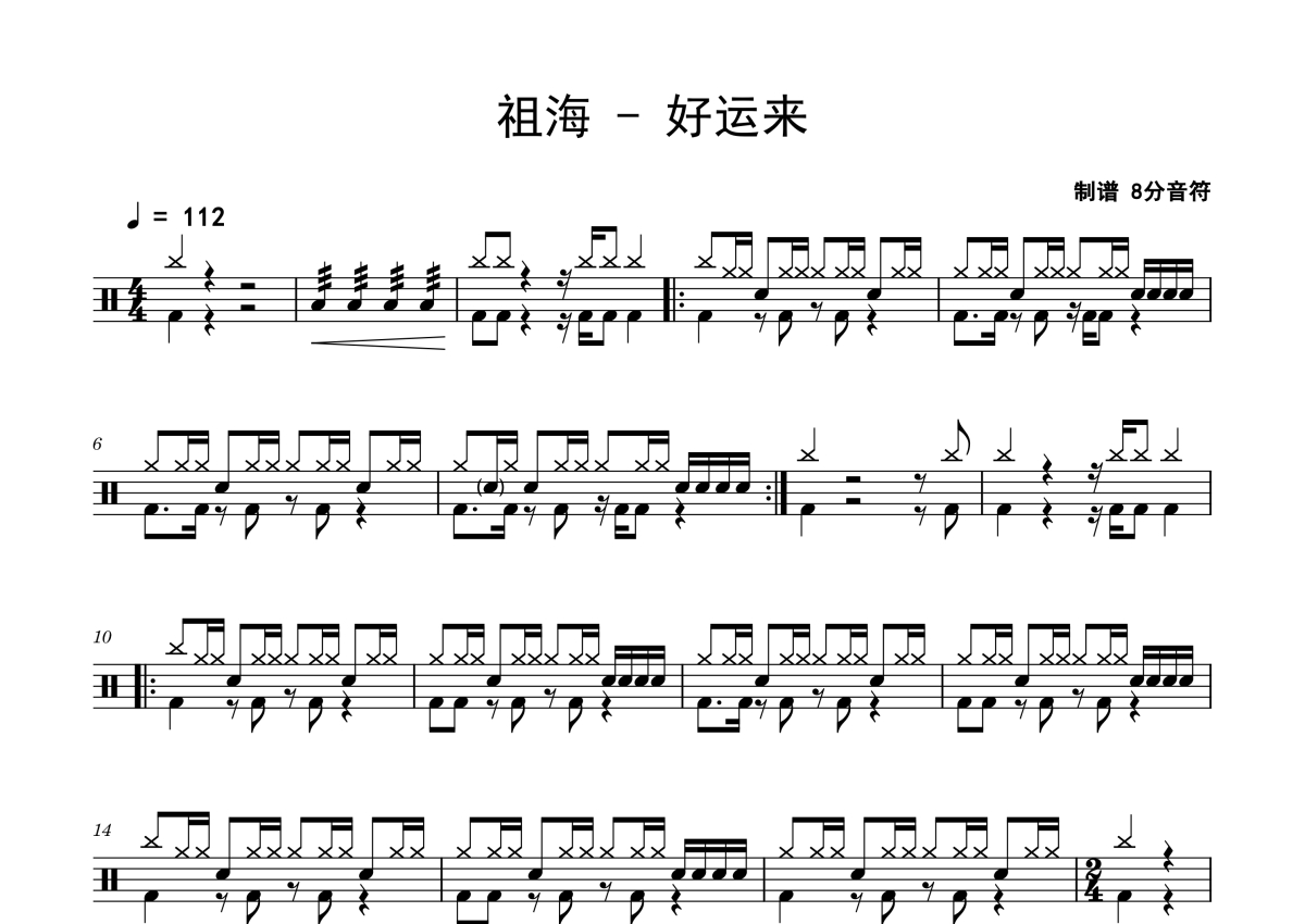《好运来》是祖海演唱的一首歌曲,拍号为4/4拍,歌曲速度为每分钟112拍,这份鼓谱共有两张高清图谱,图谱由 @老虎不说谎 编配上传,图谱使用五线谱编配,使用这份好运来架子鼓谱,你将能够轻松地敲打出这首祖海的好运来,快来尝试吧。