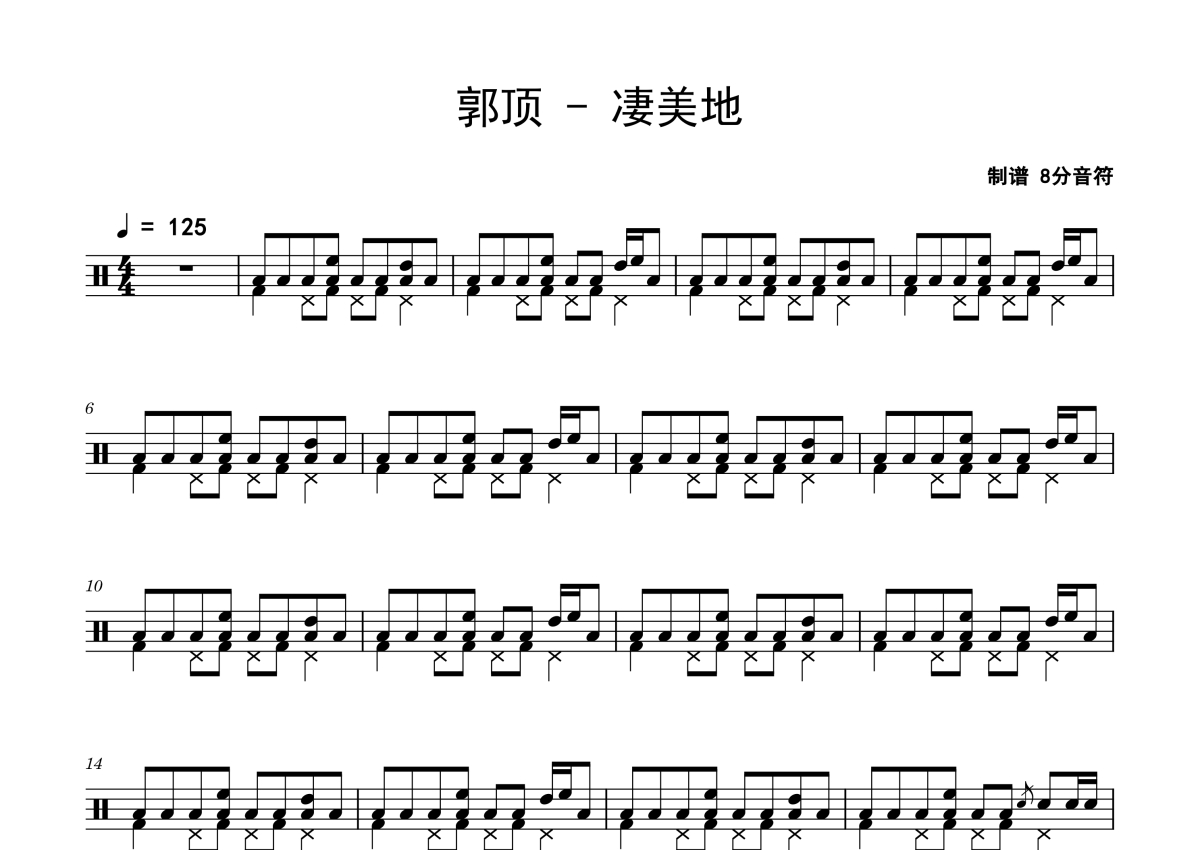 《凄美地》是郭顶演唱的一首歌曲,拍号为4/4拍,歌曲速度为每分钟125拍,这份鼓谱共有四张高清图谱,图谱由 @老虎不说谎 编配上传,图谱使用五线谱编配,使用这份凄美地架子鼓谱,你将能够轻松地敲打出这首郭顶的凄美地,快来尝试吧。
