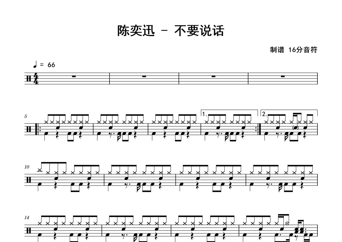 《不要说话》是陈奕迅演唱的一首歌曲,拍号为4/4拍,歌曲速度为每分钟66拍,这份鼓谱共有两张高清图谱,图谱由 @老虎不说谎 编配上传,图谱使用五线谱编配,使用这份不要说话架子鼓谱,你将能够轻松地敲打出这首陈奕迅的不要说话,快来尝试吧。