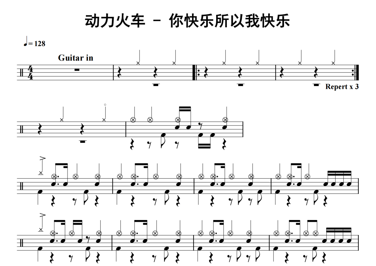 《你快乐所以我快乐》是动力火车演唱的一首歌曲,拍号为4/4拍,歌曲速度为每分钟128拍,这份鼓谱共有四张高清图谱,图谱由 @老虎不说谎 编配上传,图谱使用五线谱编配,使用这份你快乐所以我快乐架子鼓谱,你将能够轻松地敲打出这首动力火车的你快乐所以我快乐,快来尝试吧。