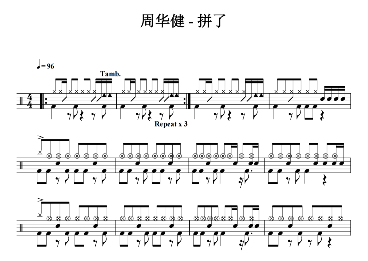 《拼了》是周华健演唱的一首歌曲,拍号为4/4拍,歌曲速度为每分钟98拍,这份鼓谱共有三张高清图谱,图谱由 @老虎不说谎 编配上传,图谱使用五线谱编配,使用这份拼了架子鼓谱,你将能够轻松地敲打出这首周华健的拼了,快来尝试吧。
