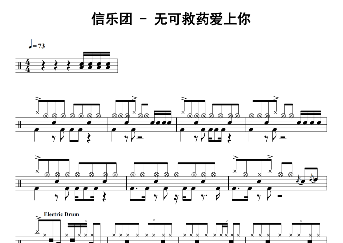 《无可救药爱上你》是信乐团演唱的一首歌曲,拍号为4/4拍,歌曲速度为每分钟73拍,这份鼓谱共有四张高清图谱,图谱由 @老虎不说谎 编配上传,图谱使用五线谱编配,使用这份无可救药爱上你架子鼓谱,你将能够轻松地敲打出这首信乐团的无可救药爱上你,快来尝试吧。