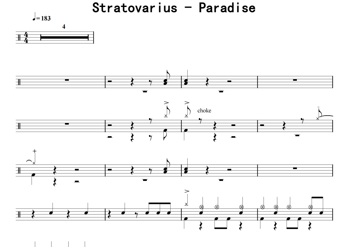 《Paradise》是Stratovarius演唱的一首歌曲,拍号为4/4拍,歌曲速度为每分钟183拍,这份鼓谱共有五张高清图谱,图谱由 @老虎不说谎 编配上传,图谱使用五线谱编配,使用这份Paradise架子鼓谱,你将能够轻松地敲打出这首Stratovarius的Paradise,快来尝试吧。