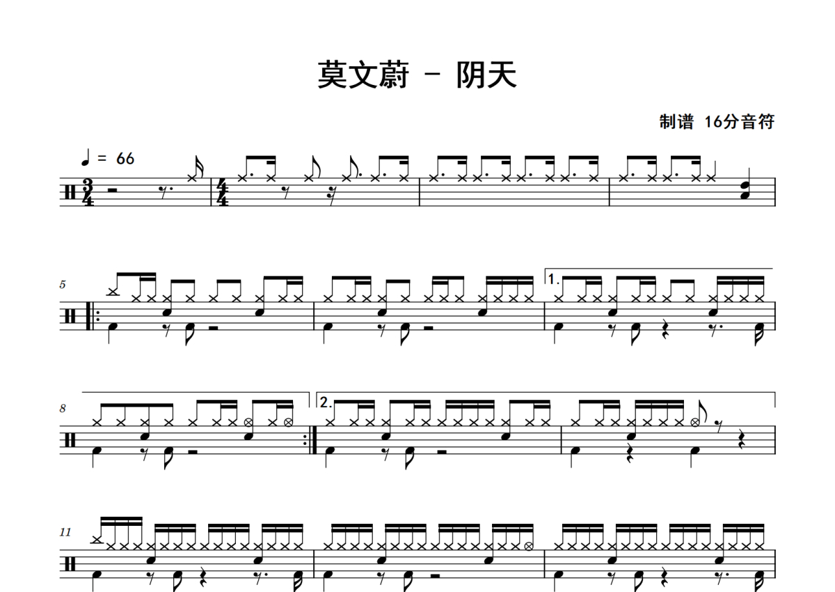 《阴天》是莫文蔚演唱的一首歌曲,拍号为3/4拍,歌曲速度为每分钟66拍,这份鼓谱共有两张高清图谱,图谱由 @老虎不说谎 编配上传,图谱使用五线谱编配,使用这份阴天架子鼓谱,你将能够轻松地敲打出这首莫文蔚的阴天,快来尝试吧。