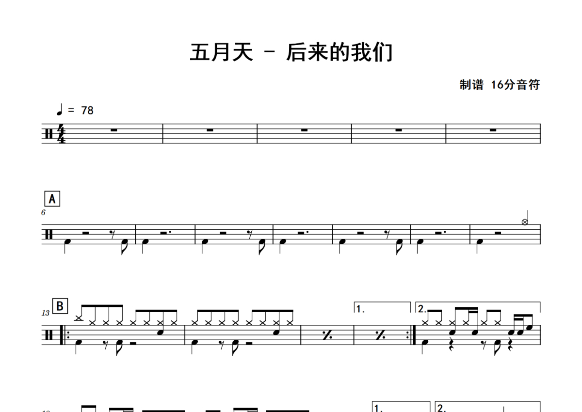 《后来的我们》是五月天演唱的一首歌曲,拍号为4/4拍,歌曲速度为每分钟78拍,这份鼓谱共有三张高清图谱,图谱由 @老虎不说谎 编配上传,图谱使用五线谱编配,使用这份后来的我们架子鼓谱,你将能够轻松地敲打出这首五月天的后来的我们,快来尝试吧。