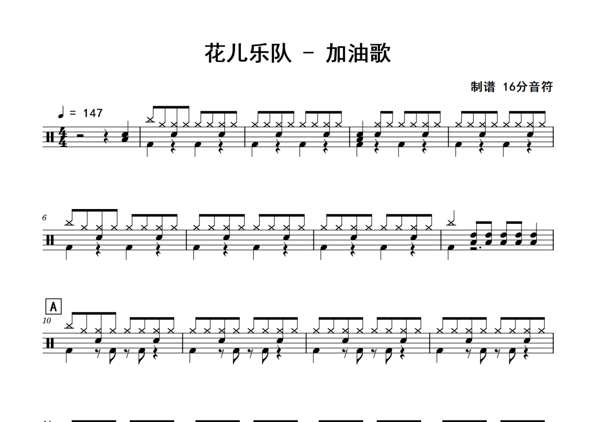 《加油歌》是花儿乐队演唱的一首歌曲,拍号为4/4拍,歌曲速度为每分钟147拍,这份鼓谱共有三张高清图谱,图谱由 @老虎不说谎 编配上传,图谱使用五线谱编配,使用这份加油歌架子鼓谱,你将能够轻松地敲打出这首花儿乐队的加油歌,快来尝试吧。